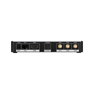 – Aansluitingen: HDMI Audio Video 2.1a tot 4K 60p HDR (HDCP 2.2, CEC, Deep Color, 12-bit, xvYCC), 1x USB 2.0, 1x USB 3.0, optische S/PDIF audio-uitgang (TO-slink), Ethernet Gigabit 10/100/1000 Gb/s, Wi-Fi met 2 vergulde afneembare antennes, RF met speciale antenne, DC 12V ingang, voedings-LED.